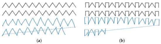 Handwriting-based pattern data were also collected from 81 subjects using a pen tablet system. The dataset had 39 children and 42 adults. In this study, we adopted two patterns. One was drawing a continuous zigzag line, essentially a continuous set of triangles without a base. Another was drawing a continuous periodic line pattern (PL) that was repeated squares and triangles sequentially without a base. The trace and predict conditions were used for each pattern. Each subject was asked to draw these four patterns on the pen tablet using a dedicated stylus pen and each drawing pattern was repeated 3 times. The traced over the sample zigzag lines are presented in Figure 3a, and the data are written on a blank sheet of paper after memorizing the sample. The traced over the sample PL lines are also presented in Figure 3b, and the data were derived from memorizing the sample and writing it on a blank sheet of paper. The data were collected by separating the zigzag line and the PL line, taking data for 30 s, resting for 20 s, taking data again for 30 s, and resting for 20 s, and so on, until six data were collected. The reason for the intervals was to let the brain rest. A summary of the handwritten pattern dataset is described in Table 2.
