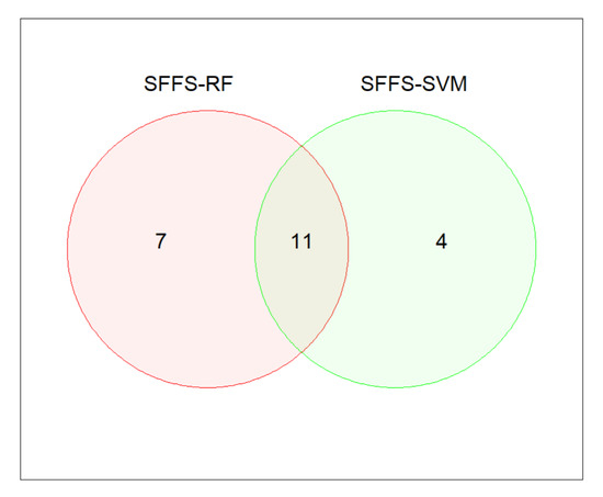 We observed that 15 and 18 features were selected by SFFS with SVM and RF classifiers. A total of 11 common features was extracted from those two methods, which are shown in Figure 4, and the listed selected features are presented in Table 6. These 11 common features were used as input features and then we applied SVM and RF classifiers to distinguish adults from children.
