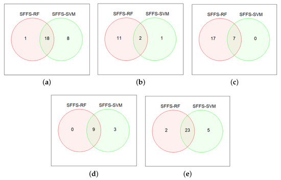 Identification of common features from SFFS-RF and SFFS-SVM for different lines of handwritten pattern dataset: (a) Feature from trace of zigzag line, (b) feature from the prediction of zigzag line, (c) feature from trace of PL line, (d) feature from prediction of PL line, and (e) feature from all handwritten patterns.
