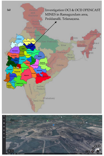 (a,b) Indian Map and Google Earth image indicating Ramagundam mines.