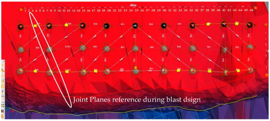 - The joint planes of the benches were identified by STRAYOS software and marked with white powder on the bench top surface to avoid the seizing-up of drilling bits in joints and to have a reference in deciding blast pattern and connections, as shown in Figure 10. Table 1 shows the design burden and spacing values in the O-PITBLAST that yielded good predicted results. The drill bit diameter was 150 mm, which was adequate for the existing bench height, burden, and spacing, and the drilled holes are shown in Figure 11.