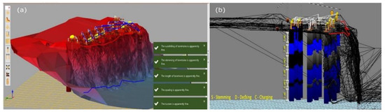 A 12 m bench with SME explosive was designed with alternative decking at 0.5 m, 2.5 m, and 1 m and was fired with a V pattern in the presence of joints, as shown in Figure 7. By a manual method it is difficult to include all of the parameters; therefore, computer software called O-PITBLAST SOFTWARE was used for designing the blast round. Similarly, blast check and charging-checking are shown in Figure 8a,b.