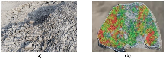 AI automatically detects the boundary of a muck pile and allows the user to change the edge points as desired; different rock fragmentation sizes will be marked with different colors in the configured boundary, as shown in Figure 12a,b. All blasts produced fragmentation graphs similar to the one shown in Figure 13.