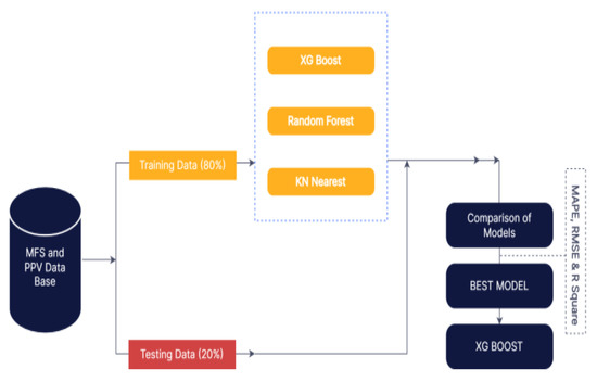 The data in this study were split into two sections: a training dataset and a testing dataset. The majority of the datasets (about 118 blasting events) are utilized for training, and the remaining (28 observations) are used for testing. The training dataset is utilized to create the aforementioned models, as shown in Figure 15. The testing dataset is used to evaluate the performance of the built models.