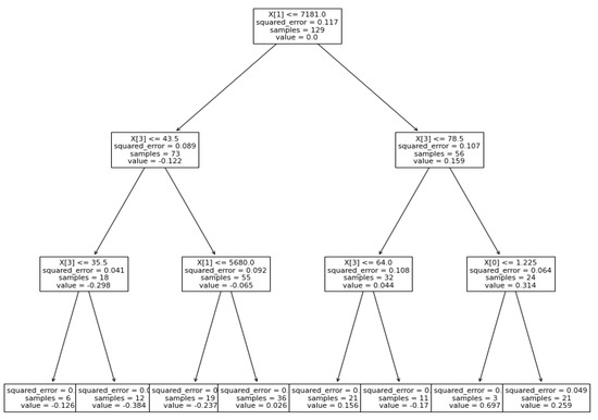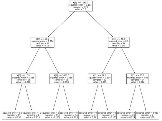 The initial prediction began by taking into account the mean of the dependent variables, MFS and PPV, from the dataset. The residual values from the previous prediction points were then computed. Furthermore, utilizing (80%) of the data, the model was trained to build an XG Boost tree using Equations (1)–(3). As illustrated in Figure 18, Figure 19, Figure 20 and Figure 21 the tree divided the data into two portions. The similarity score and gain were calculated by taking the average of the two nearest leaves and moving the residue to the leaf with the highest score and gain. To avoid model complexity, the learning rate and maximum depth were set to 1.0 and 3. After acquiring predictions (residuals) from model 1, all data points were run through model 1 to obtain h1(x) and the F1(x) prediction and residuals of model 2. Similarly, the technique for obtaining h2(x) for model 3 was carried out.