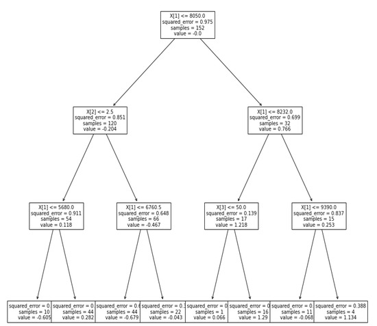 The final empirical formulas for predicting fragmentation and peak particle velocity are provided in Equations (10) and (11), which were generated from the trained model using Figure 18. The flow chart created utilizing the weight–age of the Se/Be ratio, Total explosive quantity (TE), Firing Pattern (FP), and joint angle degree (JAD) in terms of squared errors, samples, and prediction values from the trees shown in Figure 18, Figure 19, Figure 20 and Figure 21. Maximum Charge per Delay was not considered since the output iterations did not balance accuracy in anticipating fragmentation and PPV as the numbers ranged from 110 to 210 kg with little fluctuation, as shown in Table 2.
