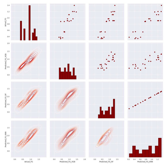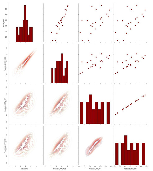 Using Python’s seaborn function, a pair grid was utilized to depict pair-wise connections in datasets. Pair grid provides greater versatility than the pair plot shown in Figure 26 and Figure 27. Pair grid assigned each variable in a dataset to a column and row on a multi-axes grid. A variety of axes level-plotting functions were employed to create a bivariate plot in the upper and lower triangles, with the marginal distribution of each variable in the diagonals. Furthermore, the hue parameter was utilized to express an extra level of conditions that plots various subplots in different hues.