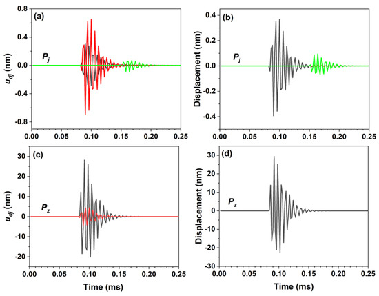Figure 4a shows the displacements, and their wave properties, at the (0.5 m, 45°, 1 m) position, generated by the