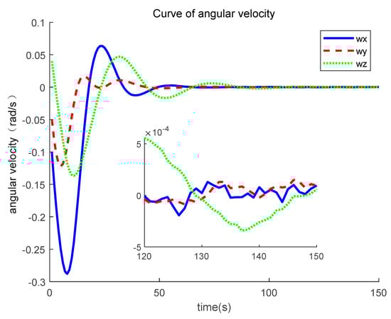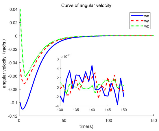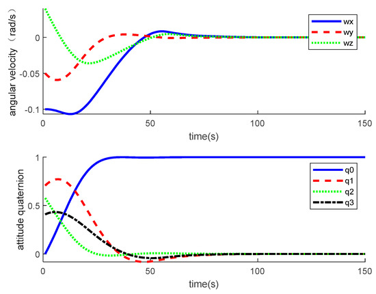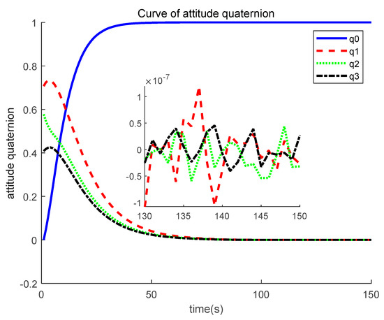 Based on the simulation results, it could be found that the system is stable under a standard PD controller. Based on Figure 1 and Figure 2, system convergence time is about 120 s, and steady accuracy is about 6 × 10−4 rad/s of angular velocity and 1.5 × 10−3 of attitude quaternion. (Generally in a satellite attitude control issue, when the system state approaches its equilibrium point, i.e., , we have . Hence, in this condition, the steady accuracy of the Euler angle is about 3 × 10−3 rad, i.e., 0.17 degree, and in later text, this derivation will be omitted.)
