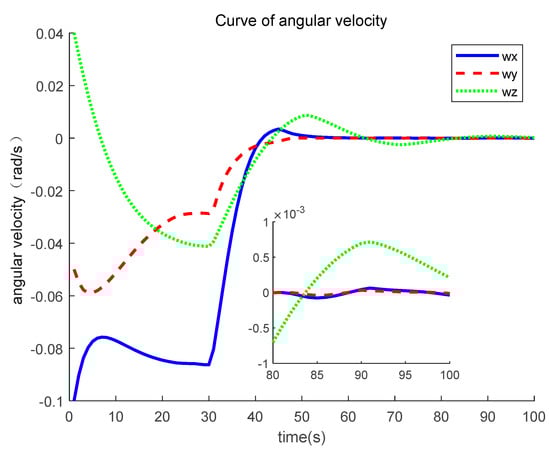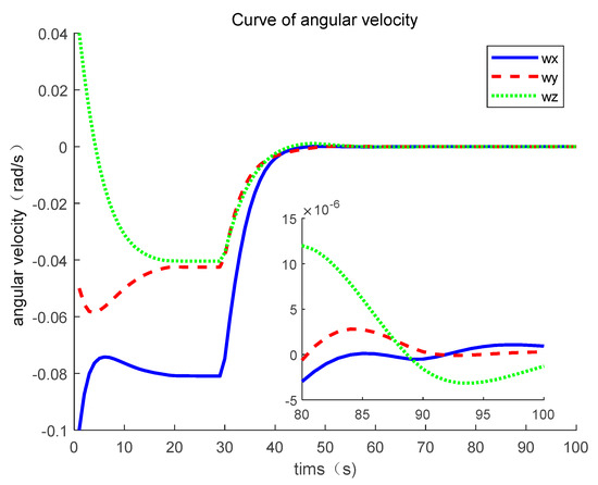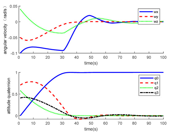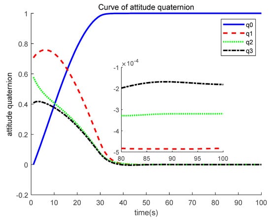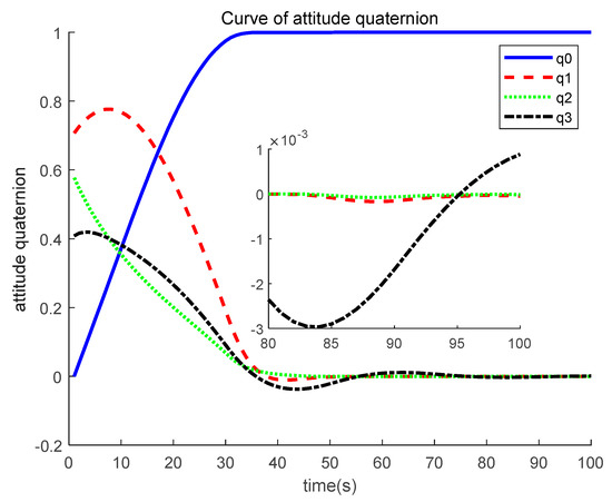 Based on Figure 5 and Figure 6, it could be found that the system is stable under the controller proposed in this paper. The system convergence time is about 50 s, which is largely improved compared to the standard PD controller (almost 40% of the PD controller and 60% of the finite time controller); this verifies that the method proposed in this paper could improve the system convergence rate with a variable structure controller. In addition, the system steady accuracy at 100 s is about 1.5 × 10−5 rad/s of angular velocity and 5 × 10−4 of attitude quaternion, i.e., 0.01 deg of the Euler angle, which is at the same level compared to the standard PD controller. By comparing the simulations results in this section and Section 4.1, it could be found that the chattering issue of angular velocity is largely relieved, and this verifies the effectiveness of the integral term. Based on the integral partition algorithm, the integral term does not slow down the system convergence rate; meanwhile, system robustness to the disturbance is maintained.
