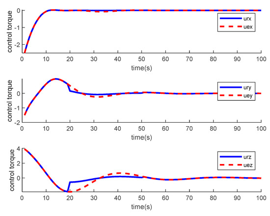Based on Figure 9 and Figure 10, it could be found that the system is still stable when the actuator failure happens, and this proves the effectiveness of the method proposed in this paper. The fault detection factor could judge whether the actuator failure happens and when it happens, and the fault tolerant controller could ensure system stability. It could also be found that the system convergence rate is about 80 s, which is slower than the controller in Section 3.2, but still better than the standard PD controller. The system convergence rate is about 1 × 10−3 rad/s of angular velocity and 3 × 10−3 of attitude quaternion, i.e., 0.15 deg of the Euler angle, which means that when actuator failure is relieved, the system steady accuracy could still be maintained at a high level. Based on Figure 11 (blue curve is the actual torque and red curve is the expected torque), it could be found that the effect of the actuator is the drop of output torque, and based on the simulation results, it could be found that the proposed method is robust to this type of failure.