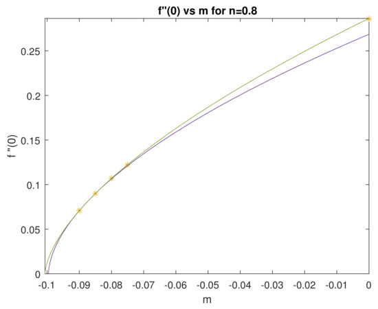 On the other hand, assume . This would imply that the solution gradient is at some very small . At the same time, we would have . In fact, at the point where , the two terms in the governing Equation (10) become comparable and almost equal for m very close to zero. Therefore, if we take proportional to , or say for some but close to , then the second term in (10) becomes negligible with m very close to zero and large n. We can then use the estimate on leading to . In particular, if then it must be that , so that could not be satisfied and a solution would not exist. (A mathematically precise classical - argument can be made here, but we choose to omit it and focus on what is more relevant to us from the practical viewpoint). We have shown that
