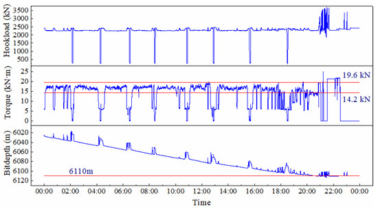 As shown in Figure 6, it is the change of hook tension and torque from 20:11:28 to 21:21:28. During 20:50:28–20:51:28, the torque suddenly increases from 14.2 to 19.6 kN, which is consistent with the mudlog data report. Therefore, the accurate time of stuck pipe can be determined as 20:51:28.