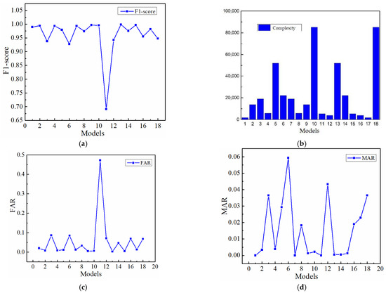 Different evaluation indexes of classification model. (a) F1 of each model; (b) Complexity of each model; (c) FAR of each model; (d) MAR of each model.