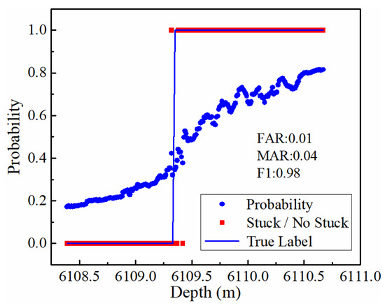 Figure 11 shows the stuck pipe index 2 (stuck pipe probability), which is obtained from the intelligent prediction model of stuck pipe probability based on the LSTM network in Section 3.2, which can provide early warning of stuck pipe through the changes of mudlog data. The red straight line indicates the predicted result of stuck (stuck/non stucking). Blue scatter indicates the probability of stuck pipe. The blue straight line represents the real sample of the site (0: no stuck, 1: stuck).