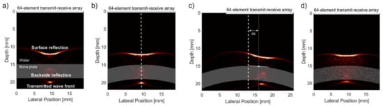 A few recent technologies utilize sophisticated array-based pulse-echo imaging technology to estimate BMD in trabecular bones at major fracture sites (i.e., spine and proximal femur [13]), or to measure structural and material properties in the cortical bone (i.e., tibia and radius) [14,15]. Most medical ultrasound scanners on the market implement the standard delay-and-sum (DAS) beamforming method to reconstruct the brightness mode (hereinafter called B-mode) images. This technique uses a transducer array to transmit and receive focused ultrasound signals inside the body. Conventionally, the reconstruction of B-mode images using DAS is done by adding time specific delays to the individual ultrasound signals which are received at each element of the receiver array before summing all signals to create a beamformed received signal; therefore, the sensitivity of the beamformed signal can be maximized to a certain depth and direction. In medical ultrasound scanners, transmit and receive focusing is performed by assuming a constant speed of sound of soft tissue (1540 m/s) along the entire sound propagation path. This approximation provides satisfactory image quality for most soft tissues, because the true velocities only vary within 10% when compared with the assumed value [16]; however, this is not the case for mineralized tissues, such as cortical bones. The radial speed of sound in cortical bone is between the range of 2800 to 3500 m/s [17], which results in a substantial refraction at the soft tissue and cortical bone interface. In case of a wrong assumption on the constant sound velocity, the delay estimation, which is necessary to focus on a particular image location, is incorrect, subsequently leading to a phase-distorted DAS signal. As a result, in a conventional B-mode image reconstructed by medical ultrasound scanners, the internal bone structures appear blurred or cannot be reconstructed at all. Aside from radiofrequency echographic multispectrometry (REMS) technology [18], this conventional DAS beamforming is currently used for bone strength assessment and fracture risk prediction. There have been efforts to overcome this false assumption of a constant speed of sound in cortical bone. Renaud et al. [14] proposed the first in vivo image reconstruction of cortical bone using a conventional medical ultrasound scanner and seismic image reconstruction. This reconstruction method provides local estimations of Ct.Th and anisotropic sound velocity.