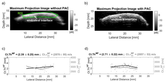 Reference cortical thickness and porosity values of the human tibia bone at the central anteromedial part were found to be Ct.ThRef = (2.65 ± 0.61) mm and 15.1%, respectively, using HR-pQCT. For the MF measurement, Ct.ThMF and Ct.ν11MF were determined in a manually selected region of interest (Figure 3a green ROI). The maximum amplitudes over all focus depths with and without PAC methods (ST + ACF + CC) are shown in Figure 3a,b. The endosteal surface of the human tibia sample is more blurred in the maximum projection image without PAC methods (Figure 3a). Without PAC, Ct.ThMF and Ct.ν11MF could be retrieved at 14 lateral scan positions, whereas with PAC, cortical parameter estimations were achieved at 29 scan positions. The mean and standard deviation of Ct.ThMF without PAC was (2.39 ± 0.25) mm, which was significantly different from the reference value. In contrast, the estimation of Ct.ThMF with PAC of (2.71 ± 0.22) mm was not significantly different from the reference value. The estimated cortical speed without and with PAC were (2870 ± 95) m/s and (2857 ± 52) m/s, respectively.
