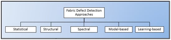 Modern machine vision-based fabric defect detection systems are an attractive scientific domain as an alternative to traditional methods. In the majority of existing papers, however, homogeneous fabrics are used as input [10]. Publications in this domain can be grouped into five subtitles (Figure 1). Further information can be found in references [11,12].