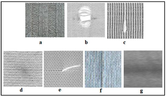 Figure 3. Examples for defect types: (a) nondefective; (b) hole; (c) weave; (d) stain; (e) thread; (f) knitting; (g) shaded.