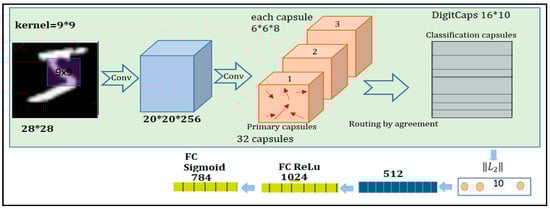 This new architecture achieves significantly better, state-of-the-art performance accuracy with MNIST data [42]. The CapsNets architecture using MNIST data is shown in Figure 6 as an example.