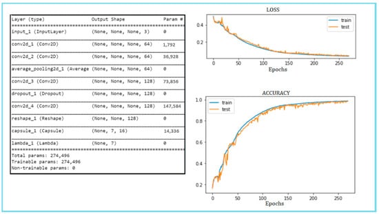 Detection accuracy and model deep dimensions are two important terms in deep learning algorithms. Studies have shown that one of the more significant ways to improve accuracy is to enlarge the network’s depth and width [43]. Deep network architectures require significant computational resources, but CapsNets have provided high accuracy results and deeper network structures. In this paper, the training and testing process is performed using the TILDA dataset. Defect recognition is based on seven categories, namely nondefective, holes, stains, knitting, threads, weaves, and shade categories. The training process is performed three times (100, 200, 270) based on epoch number changes. Details for these changes are given in Section 3.3. The ideal model parameters are given in Table 2. The structure, loss and accuracy graphics per epoch are illustrated in Figure 7.