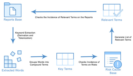 Figure 2 shows how the words were extracted from the reports database and grouped into keywords. Then, the incidence of keywords in the risks was checked in the risks and causes database. Finally, the most relevant keywords were generated, and their frequencies calculated in the reports.