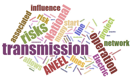 In order to evaluate and visualize the relevance of each keyword, a word cloud was generated (Figure 3). The words displayed show a relationship between the ANEEL reports and the risks raised by experts. The bigger the word’s text size, the more times this word appeared in the weekly reports. This does not mean that more frequent words get a higher weight in the probability calculation. However, since they appeared more frequently, they would probably impact more risks than smaller ones.