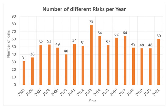 Figure 4 shows the number of specific risks found in reports from 2005 and 2021. As an example, a risk found was ID 1.11.01, which is described as non-approval of the environmental study by the licensing agency. Its causes are pending documentation for the LP request, the elaboration of the environmental study in disagreement with the guidelines defined by the environmental agency, and a record of delay in the LP issuance request deadlines. This risk is related to the environment area in the feasibility phase (Auction-LP). It was identified by crossing the following keywords: request for issuance, term of reference, elaboration of the study, and pending at the environmental agency.