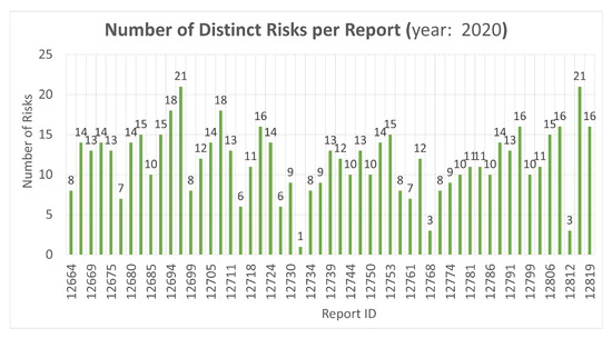 Number of distinct risks per report (year 2020). This shows how many risks are found in each report, represented by their IDs. Some reports in the year 2020 had up to 21 risks linked to them.