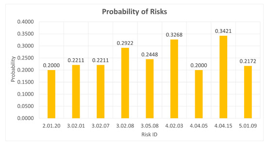 Based on Equation (2), the risk probability was calculated as shown in Figure 6. This shows only the risks with a probability higher than 20%. The risk identified with the highest probability of occurrence was identifier (ID) 4.04.15 with the following description: “not meeting the deadlines for replacing equipment already approved by ONS”. This risk is related to the O&M engineering area and the operation (O&M) phase, with the non-compliance causes aligning with the ANEEL guidelines in the Electric Sector Accounting Manual and the Electric Sector Asset Control Manual. The main keywords related to risk identification were accounting for the electricity sector, asset control of the electricity sector, sector accounting manual, manual for asset, and asset control.