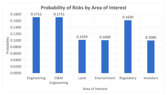 Figure 7 presents the risk probability by area of interest: engineering, O&M engineering, land, environment, regulatory, and investors. We can observe that the highest risk probabilities were found in areas related to engineering, presenting risk keywords such as alteration of the route, fixed assets in service, and charge the costs. Additionally, the regulatory area contained identified risks through keywords such as changes in the public notice, the anticipation of the commercial operation, and the application of the penalty.