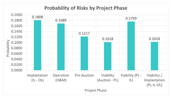Moreover, Figure 8 shows the risk probability per phase. The phases were implementation (LILO), operation (O&M), pre-auction, feasibility (Auction-LP), feasibility (LP-LI), and viability/implementation (LP-LI-LO). In this case, the phases that presented the highest risk probability were implementation (LI-LO) and feasibility (LP-LI). The implementation phase presented risk keywords such as opening the administrative process, compliance with conditions, and fixed assets in service. The feasibility phase contained risks identified by keywords such as plan approval, asset control of the electricity sector, and the existence of pending issues.