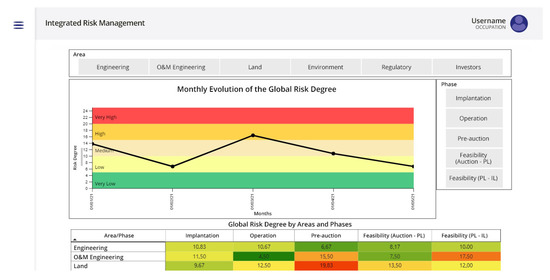 Lastly, a web-based dashboard system was developed for the management and visualization of the risk probability. This enabled users to interact with graphs and calculate the risk probabilities for and impacts on transmission line implementation projects. Figure 9 shows the risk trend interface. This graph can be customized by many filters, including time intervals, areas, and phases to select and generate the results for analysis.