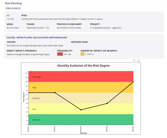 To better monitor the managers using the dashboard, each existing risk would have a monthly evolution graph of its degree and preliminary information regarding the selected risk. For instance, Figure 10 shows the webpage for risk 1.01.03: conflict with the Quilombola Remnant Communities (CRQs) regarding the TL route.