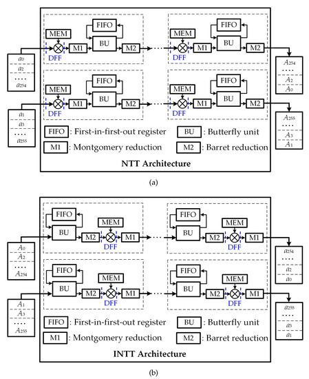 In order to accelerate NTT/INTT operations, the coefficients of input polynomial are divided into two parts to be processed in parallel. The proposed NTT/INTT architecture for Kyber is presented in Figure 1. As can be seen from Figure 1a, the coefficients of input polynomials are divided into two groups, odd and even coefficients, so that they can be handled simultaneously. Each group will be processed through seven stages which include two modulo reduction modules, butterfly units, first-in-first-out (FIFO) registers, and pipelined stages. Values of and are loaded from memory (MEM). The output of the NTT module includes two parts, and , corresponding to the coefficients and of the input polynomial. In the proposed NTT architecture, modulo reduction modules M1 and M2 are Barret reduction [18] and Montgomery reduction [19], respectively. Architectures of Montgomery reduction and Barret reduction are introduced in Figure 2a,b, respectively.