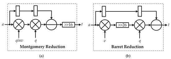 Modulo reduction architectures: (a) Montgomery reduction and (b) Barret reduction.