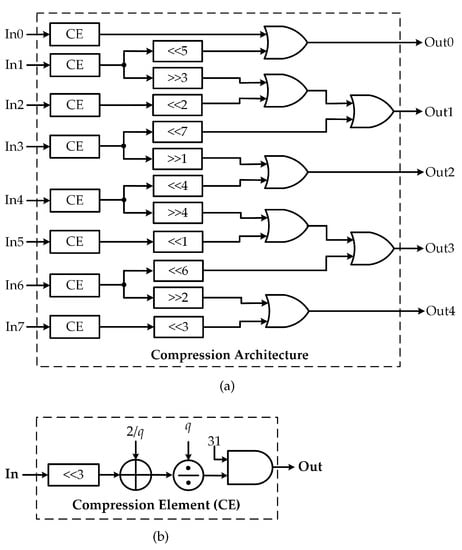 The architecture design of the compression block is presented in Figure 5. The compression elements (CE) in Figure 5a are detailed in Figure 5b.