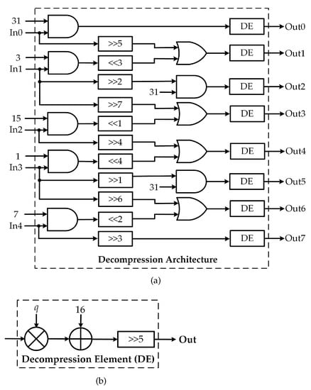 Decompression block: (a) decompression architecture, and (b) decompression element.