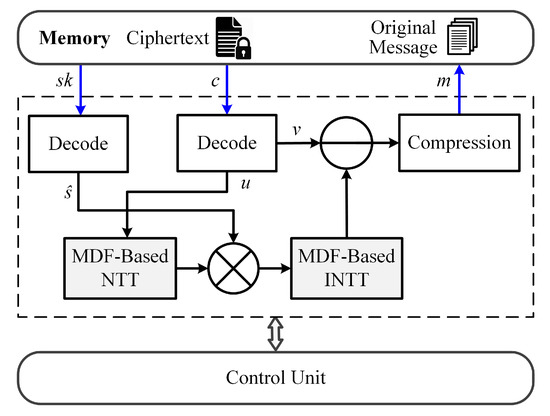 The proposed Kyber decryption architecture to recover the input message m from ciphertext and secret key is presented in Figure 7.