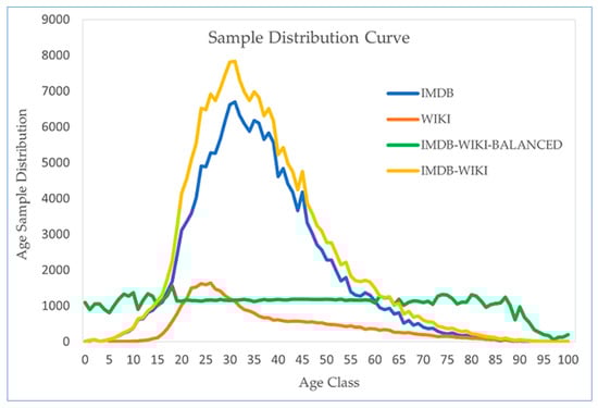 Additionally, some online data augmentation was also performed by rescaling the images into 256 × 256 pixels, and a crop of 224 × 224 pixels from the center was input to the network during training as a measure to alleviate the overfitting issues as well as the robustness of the model. The subsequent data distribution of the underlying age classes prior to and after initiating parity in the IMDB-WIKI dataset is presented in Figure 4.