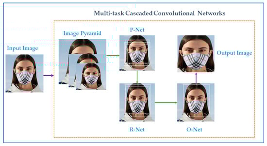 Human face detection becomes an extremely difficult task when there are huge appearance variations and external factors. A standard network expects an input image of identical size, centered position, and less background. As a practice, the majority of age estimation systems perform face detection as an essential initial step because mining discriminative facial features helps the systems to make final decisions. There are two major parts, named detection and alignment. Hence, a cascaded multi-task framework [7] is employed for face detection, where detection and alignment maintain an implicit relationship for performance gain. The multi-task cascaded convolutional neural network (MTCNN) face detection process is graphically visualized in Figure 5. Since deep CNNs are effectively capable of dealing with tiny alignment errors, our goal was to choose a robust face detector ensuring face alignment just via a marginal up-frontal rotation [6]. As a result, the overall age error was reduced while using the detected face as input rather than a whole image.