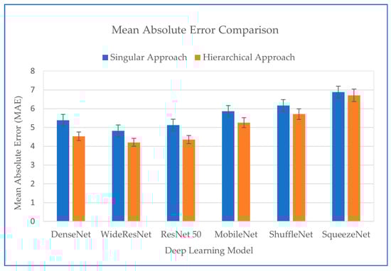It is worth mentioning that lightweight models demonstrate a slightly higher MAE than deeper models but are competent enough for deployment in low-end devices. Additionally, we performed a statistical significance test to ensure the system’s robustness and proved that the performance achieved through hierarchical and singular approaches was significantly different (see Section 4 and Figure 11).