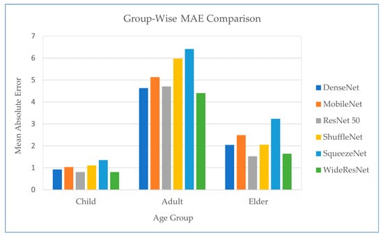 Age-group-wise mean absolute error comparison of the experimented convolutional neural networks regarding real age estimation over synthetic masked IMDB-WIK dataset.