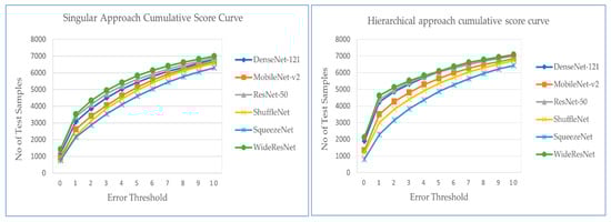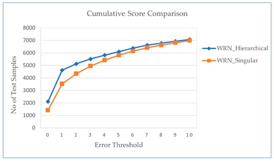 As stated in the calculation procedure of the cumulative score (CS), the CS values on the synthetic masked face image dataset under distinct error thresholds are plotted in Figure 9. From the figure, a steady growth in CS value is observed if the allowable error thresholds increase. A comparison of cumulative scores between singular and hierarchical approaches is graphically presented in Figure 10. In this comparison curve, the score achieved using the WideResNet model is plotted, where the hierarchical approach exhibits steady performance across all error threshold values. It is worth mentioning that in the early stage of the curve, the hierarchical approach contains more test samples with less errors than the singular approach and gradually performs steadily considering more error threshold values.