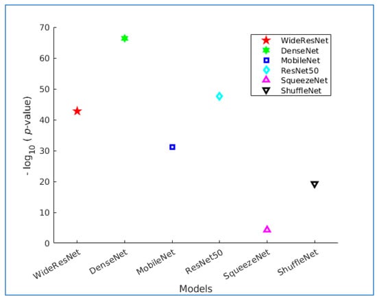 We conducted a statistical test to observe the significant differences between the two approaches (singular and hierarchical), because this allowed us to ensure the robustness of the model performance. We chose the Wilcoxon Signed-Rank test because our experimented observation does not follow the normal distribution. The null hypothesis with the Wilcoxon Signed-Rank test is that the pairwise statistics (e.g., mean) between the observations from both (singular and hierarchical) approaches are equal. The calculated p-values with a confidence level of 5% validate that we would reject the null hypothesis, concluding that the means between the groups are different. Since the p-values contain long fractional parts, we visualize the p-value result in Figure 11, which is similar to work [76], where is presented rather than the actual p-value.