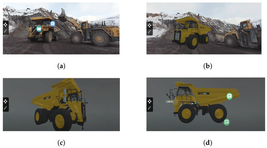 Transitioning from 2D video to the 3D virtual object: (a) 2D video. (b) Object replacement after detection and localization. (c) Object rotating in front of the user viewpoint. (d) Digital information contextualized with the vehicle model. The corresponding videos can be found here (https://youtu.be/E1fwuexrCo0, accessed on 20 April 2022).