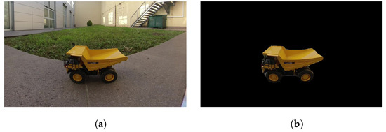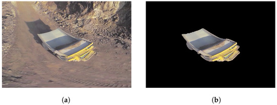 The result of the trained convolutional model Yolact++ for an equirectangular image of a truck. (a) An example of an input image showing a truck in a mining environment. (b) Result of the segmentation in which the truck is correctly segmented.