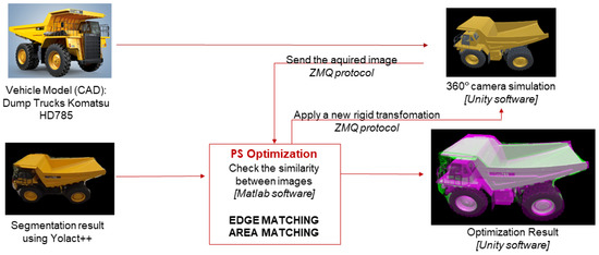 Through a connection based on the ZMQ protocol, we allow data exchange between Unity and Matlab. We put the vehicle in a random pose inside Unity. Then we take a picture of the scene using the 360° camera simulation. We will call this picture the synthetic image. In Matlab, we compare this synthetic image with the output of Yolact++ (the segmented real-world image). A score is given for the similarity between the two pictures. A Particle Swarm (PS) optimizer is in charge of finding the optimal solution. At each new iteration, the algorithm sends a new pose to Unity. The 360° simulated camera takes a new picture, and we repeat the previous steps until convergence or the maximum number of iterations are reached.