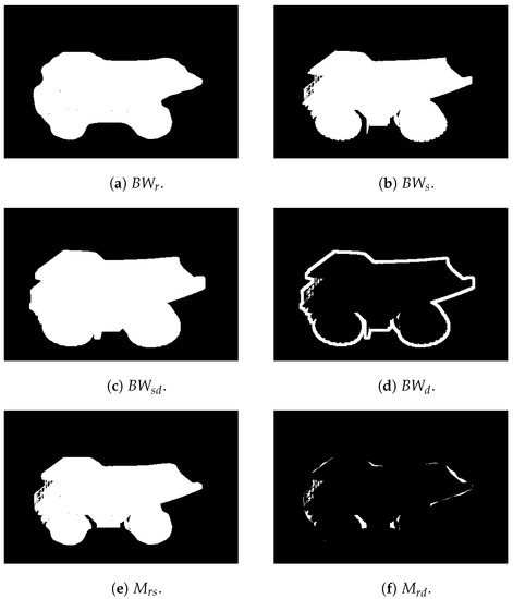 The images involved in the computation of the cost function term relative to the areas. (a) , binary image of the real-world image. (b) , binary image of the synthetic image. (c) , synthetic binary image dilated. (d) , result of the subtraction between and . (e) , result of the multiplication between and . (f) , result of the multiplication between and .