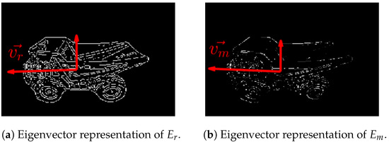 The last term of the cost function can be explained as a constraint for the edge matching to be uniform on all the parts of the edge images, i.e., and . To reach this aim, we can arrange the image coordinates of the pixels whose value is greater than 0 in a matrix of dimension , where N is the number of pixels whose value is greater than 0. Then we can compute the covariance matrices and of this matrix for and . Once and are obtained, we can compute the eigenvectors for both. Let us call and the two eigenvectors that correspond to the highest eigenvalue for and (Figure 7).